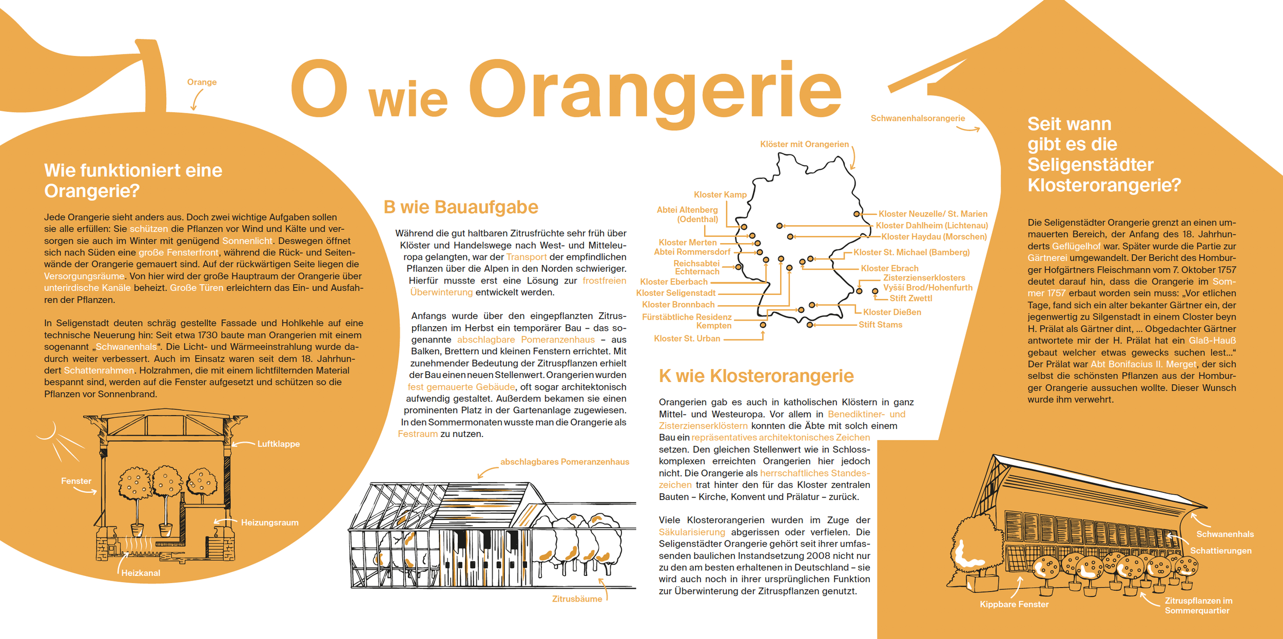 On behalf of Seligenstadt Monastery, I designed the information boards for the permanent exhibition in the historic orangery. The panels convey botanical and historical knowledge about exotic plants through custom illustrations and a clear layout, making the content approachable for visitors.