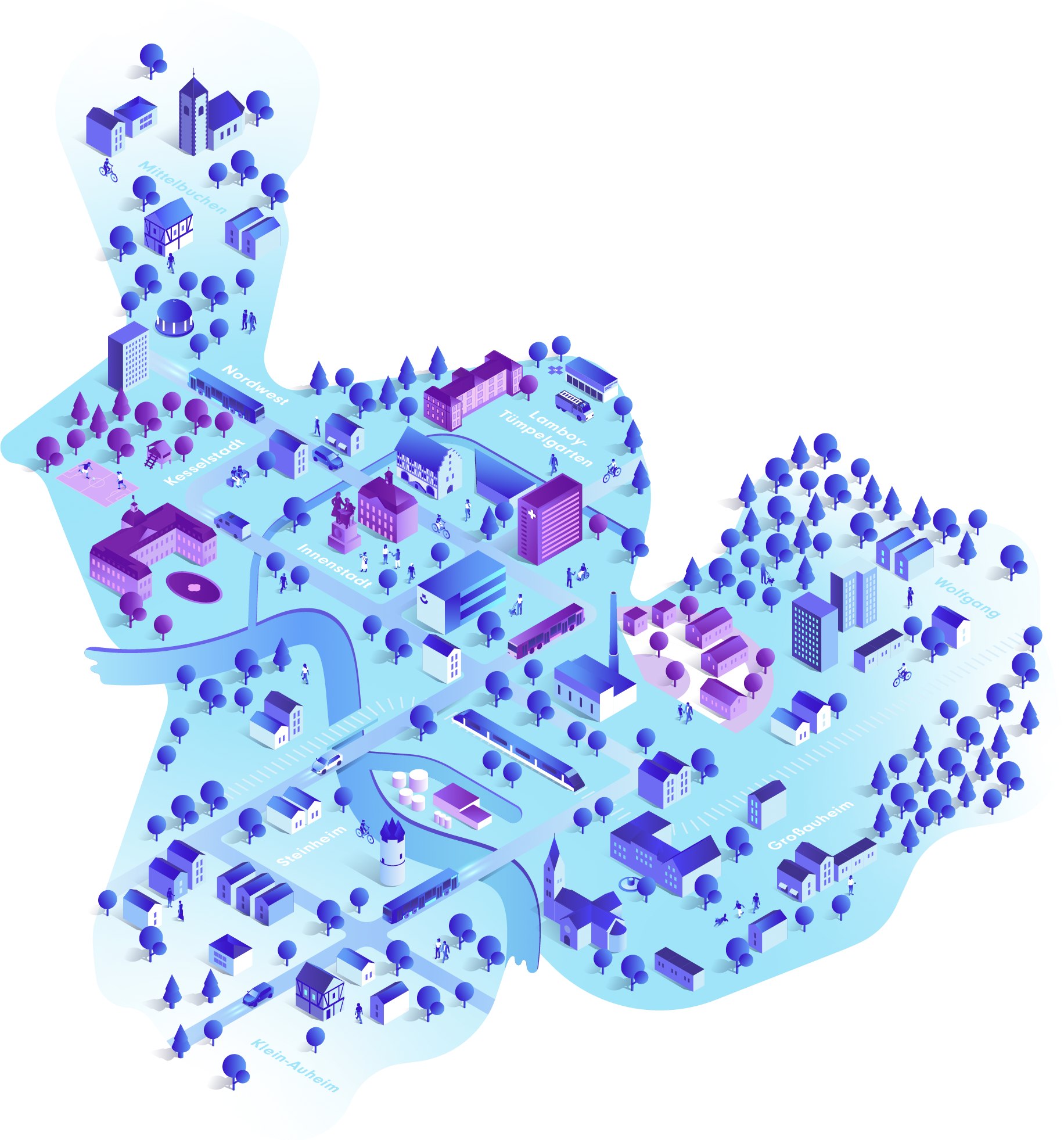 I designed an isometric digital map of Hanau that distills the city and its districts into key landmarks and buildings, enabling intuitive location-finding for urban development projects.
